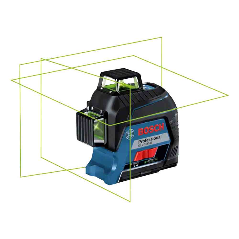 The line laser GLL 3-80 G Professional projects b1old 3 x 360° lines for high visibility. Its bright green lines provide up to four times better visibility than red lines. The tool can be used to set up entire rooms and is perfect for simultaneous horizontal and vertical levelling applications thanks to its three lines, for highly efficient work. An intuitive user interface makes it easy to operate.