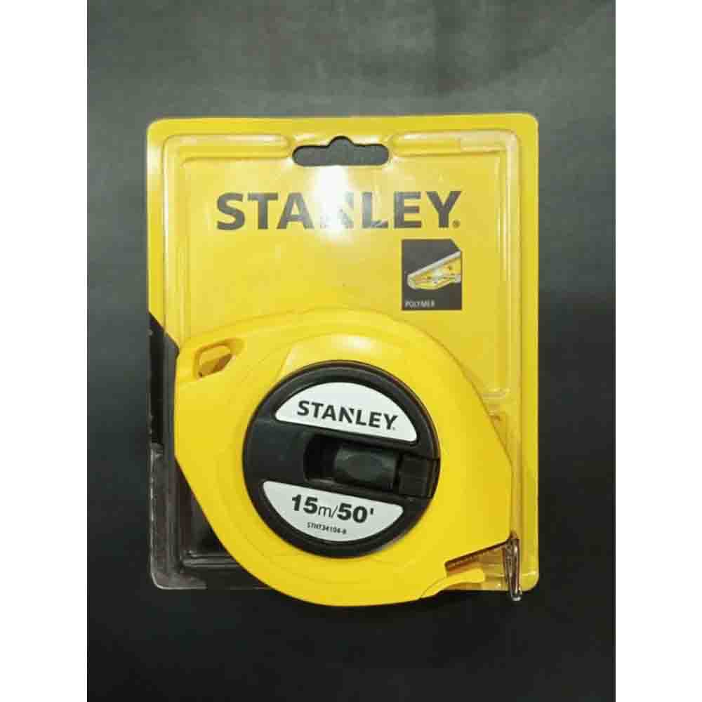 A yellow closed case steel blade measuring tape with the brand name 'Stanley' and the size '15cm/50cm' printed on it.